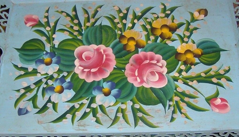 VINTAGE,HAND PAINTED,ROSES,TOLE,METAL,TRAY,15 3/4 X 22 3/4",COTTAGE BLUE,SHABBY