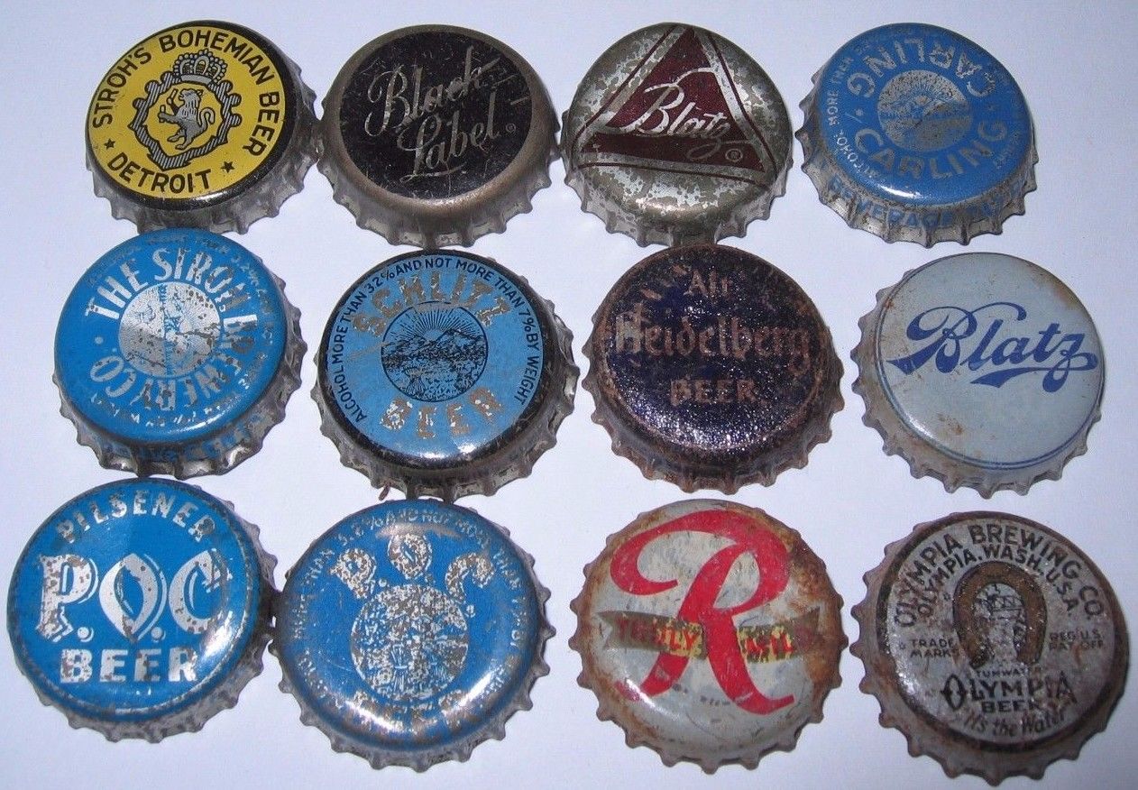 BEER BOTTLE CAPS P.O.C., STROH''S, BLATZ, CARLING, RAINIER, SCHLITZ TAX USED CORK
