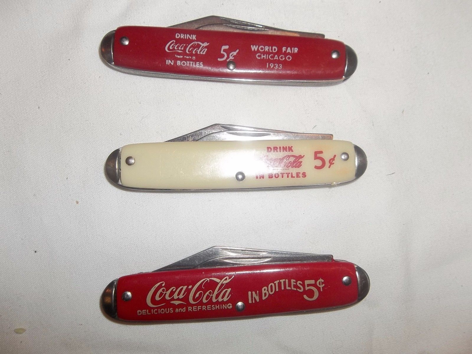 Title (ebay affiliate link): 3 Vtg Drink Coca Cola in Bottles 5 Cents Advertising Pocket Knife Lot Coke 1933+