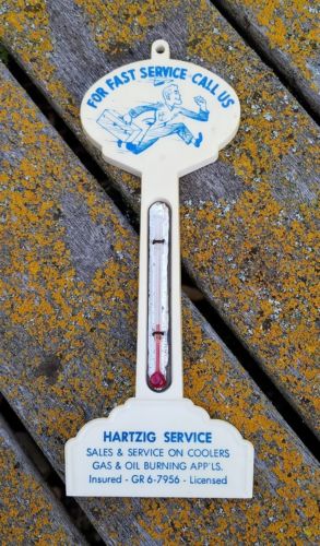 vintage original plastic advertising thermometer hartzig service gas oil burning