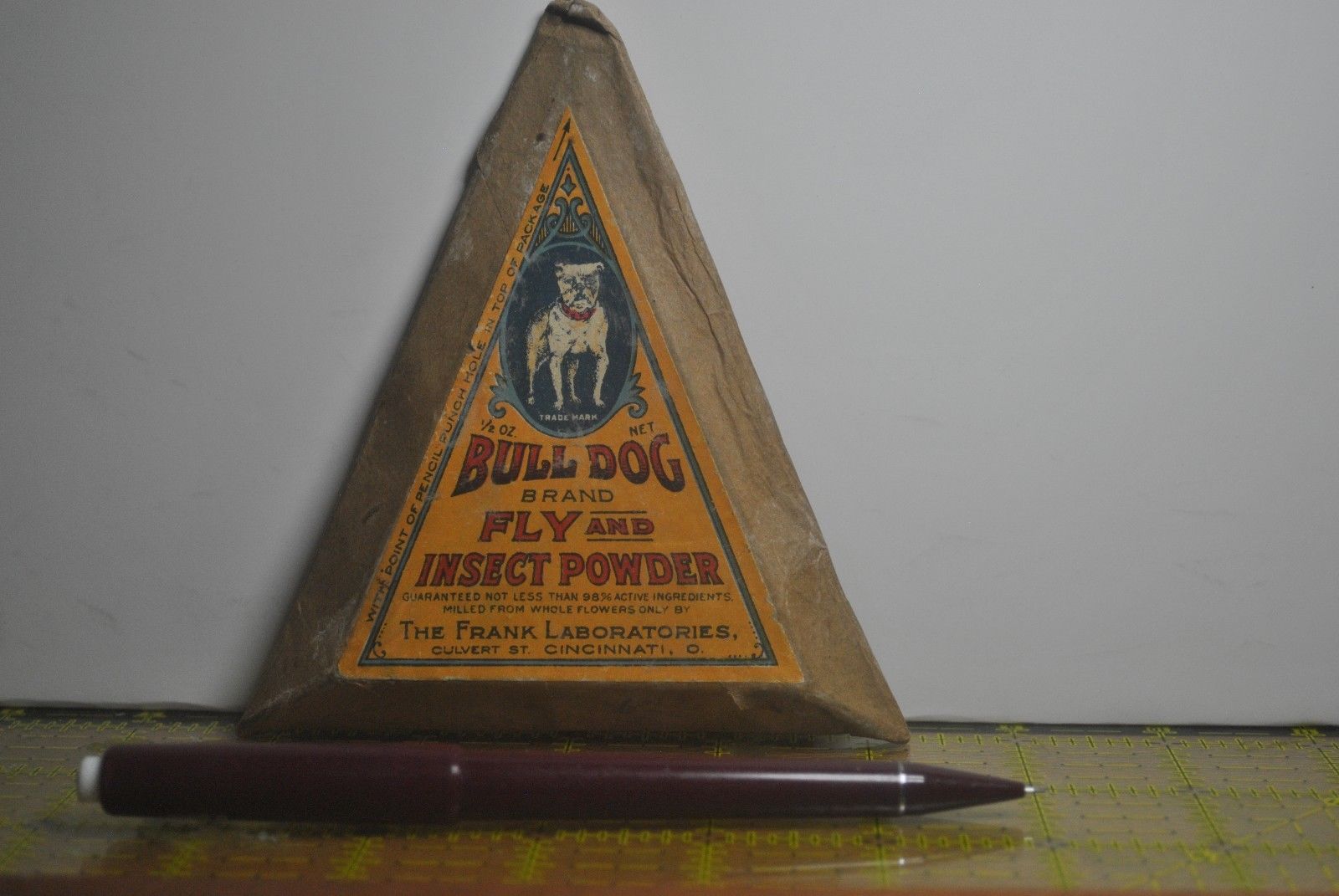 Title (ebay affiliate link): EARLY TRIANGLE CARDBOARD PACKAGE OF BULLDOG FLY & INSECT POWDER, FRANK LABS, CIN