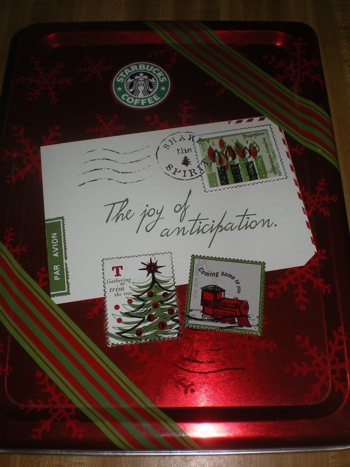 Title (ebay affiliate link): Red Starbucks Coffee Tin from 2001 "The Joy of Anticipation" Christmas Cookies