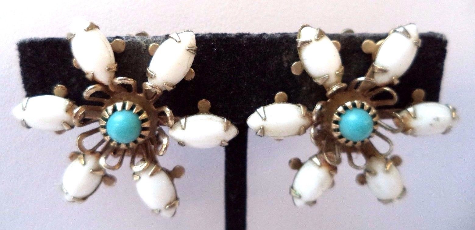 Title (ebay affiliate link): VINTAGE HIGH END TURQUOISE & MILK GLASS FLOWER 1 1/4" CLIP EARRINGS!!! G6621O