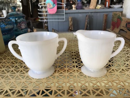 Title (ebay affiliate link): American Sweetheart Monax Sugar Bowl & Creamer Opalescent Milk Glass Opaque