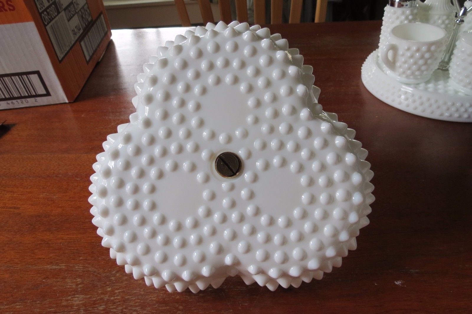 Title (ebay affiliate link): Vintage Milk Glass Hobnail Fenton Divided Candy Relish Dish with Metal Handle