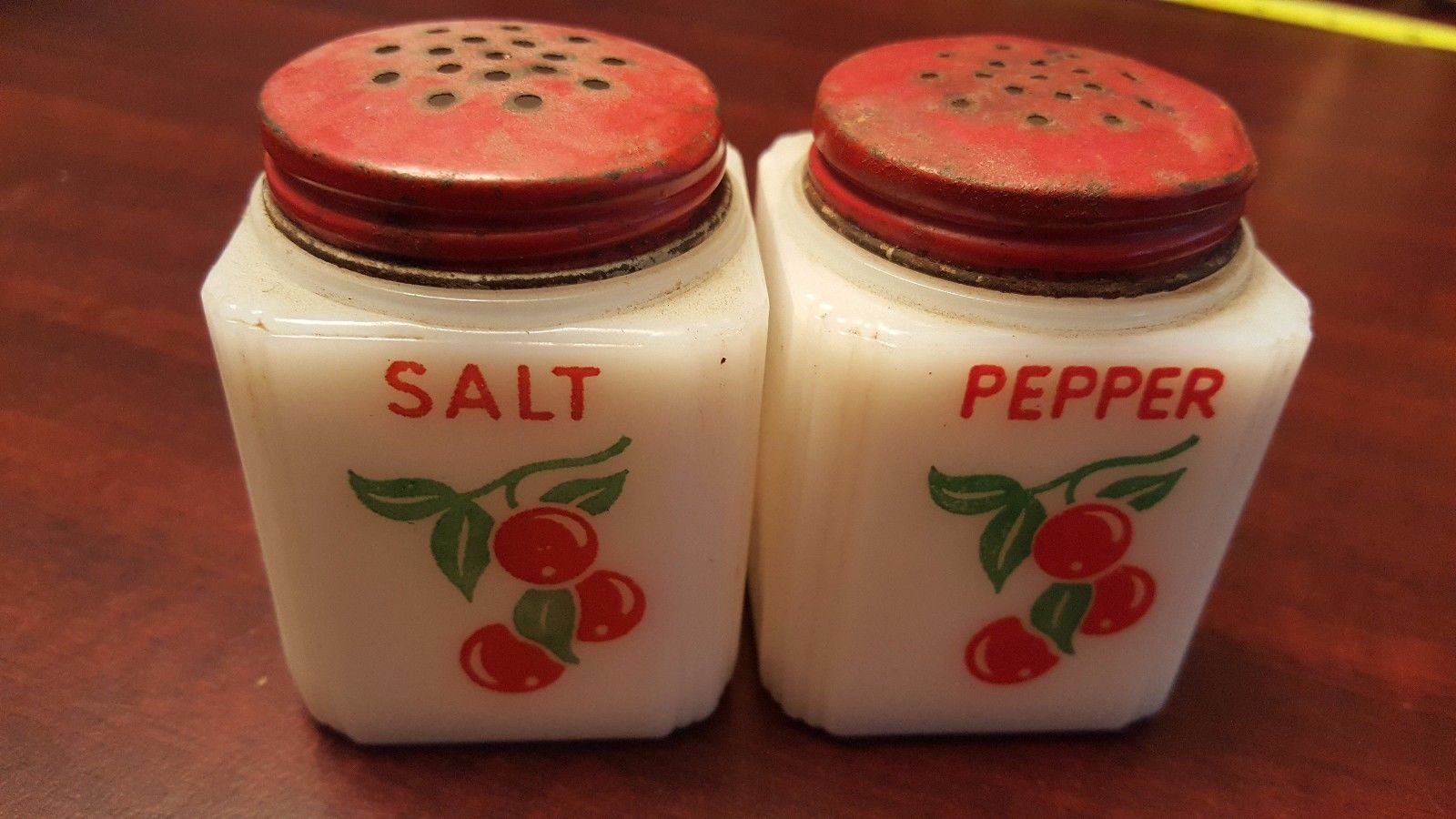 Title (ebay affiliate link): Vintage Tipp City Milk Glass Red Cherries SALT & PEPPER Range Shaker Red Cap
