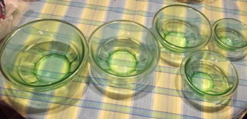 5 HAZEL ATLAS Green Rest-Well Nesting BOWLS Depression Glass Rolled Rim Lipped