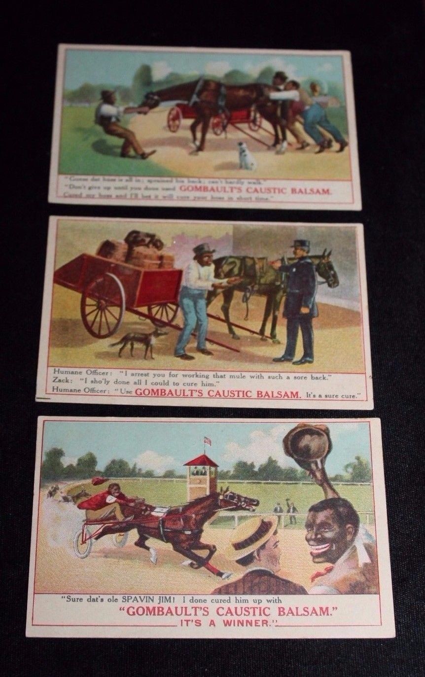 Lot Black Americana Victorian Trade Card Gombault''s Balm Horse Racing Farm Vet