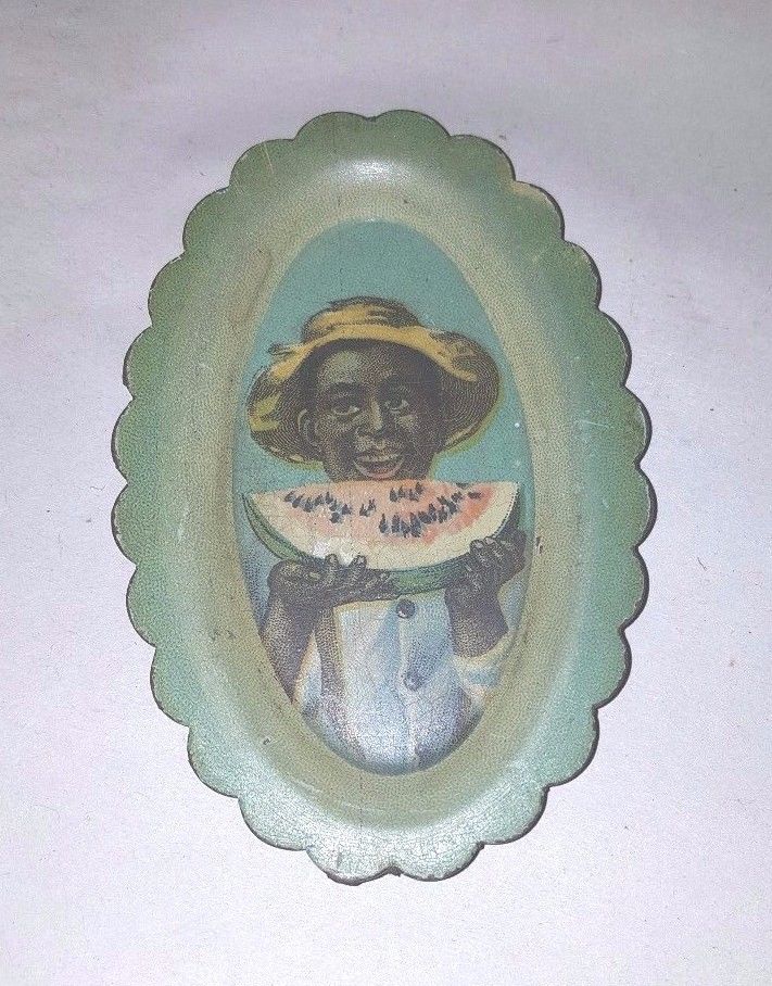 Title (ebay affiliate link): Vintage BLACK AMERICANA TIN ADVERTISING TIP TRAY Boy w/Watermelon
