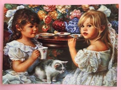Title (ebay affiliate link): "Tea drinking", Two cute girls with a kitten, russian reprinting