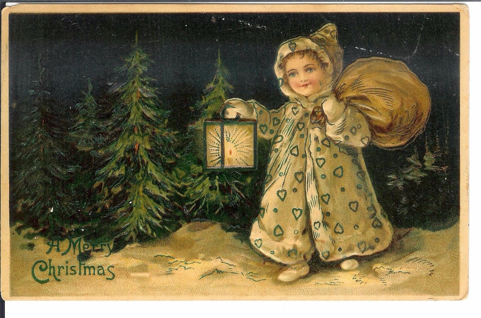 Title (ebay affiliate link): Antique Postcard Merry Christmas Embossed Child Lantern Carrying A Sack 1908