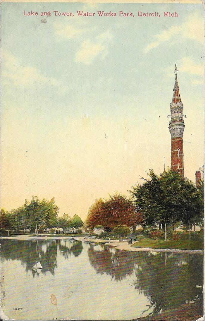 ANTIQUE 1907-1910 POSTCARD - LAKE AND TOWER, WATER WORKS PARK, DETROIT, MICHIGAN