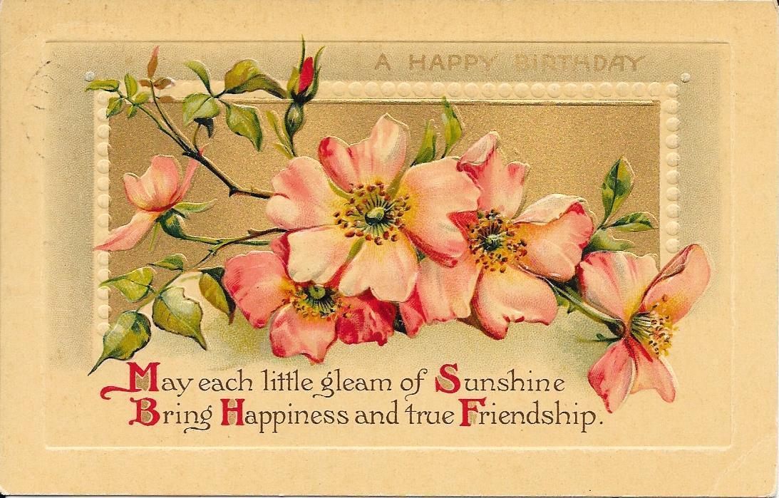 Title (ebay affiliate link): ANTIQUE 1907-1910 EMBOSSED POSTCARD - "A HAPPY BIRTHDAY" WITH PINK FLOWERS