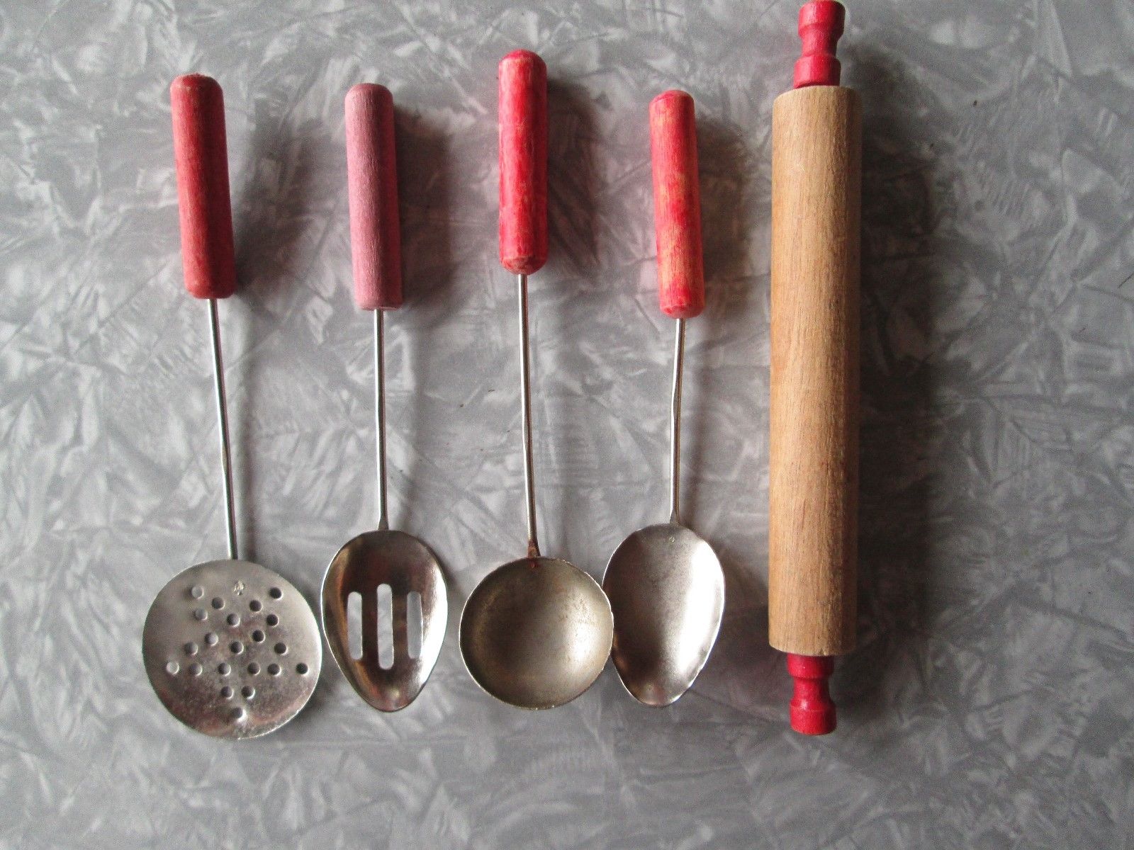 Title (ebay affiliate link): Vintage 5 piece toy cooking utensils ~ metal and red handles