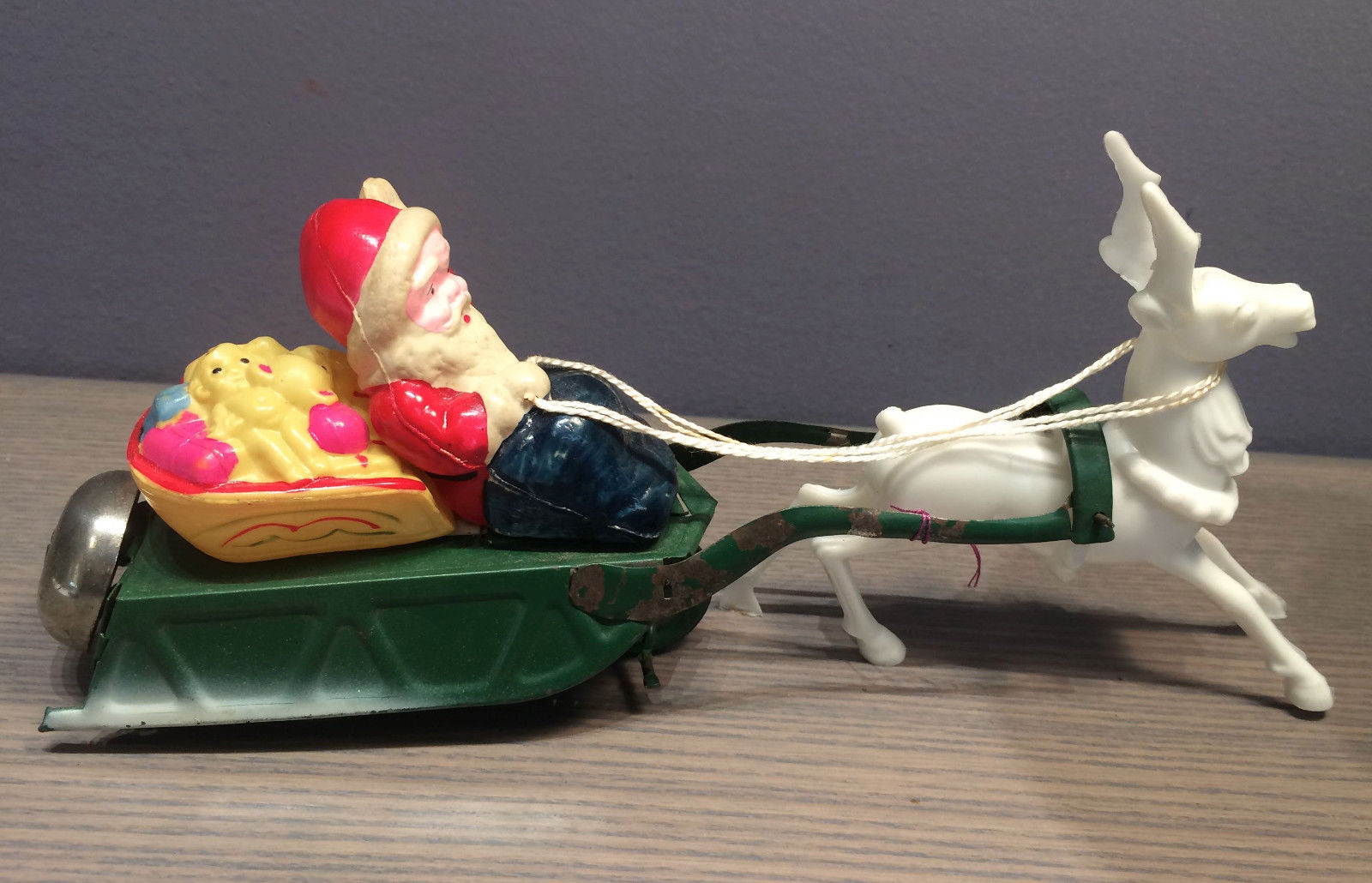 Title (ebay affiliate link): Antique Wind up celluloid SANTA ON SLEIGH w Reindeer & Bell Made in Japan