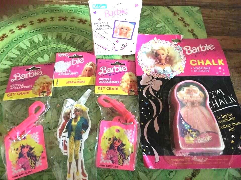 Title (ebay affiliate link): Vintage Barbie Biker Gear: 2 key chains, 3 streamers, sidewalk chalk, band-aids!