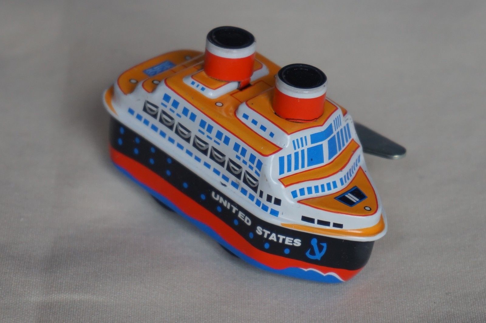 Title (ebay affiliate link): New VINTAGE Sanko 2.5" Tin Toy Windup Auto Turn US Metal Ship Boat Made in Japan