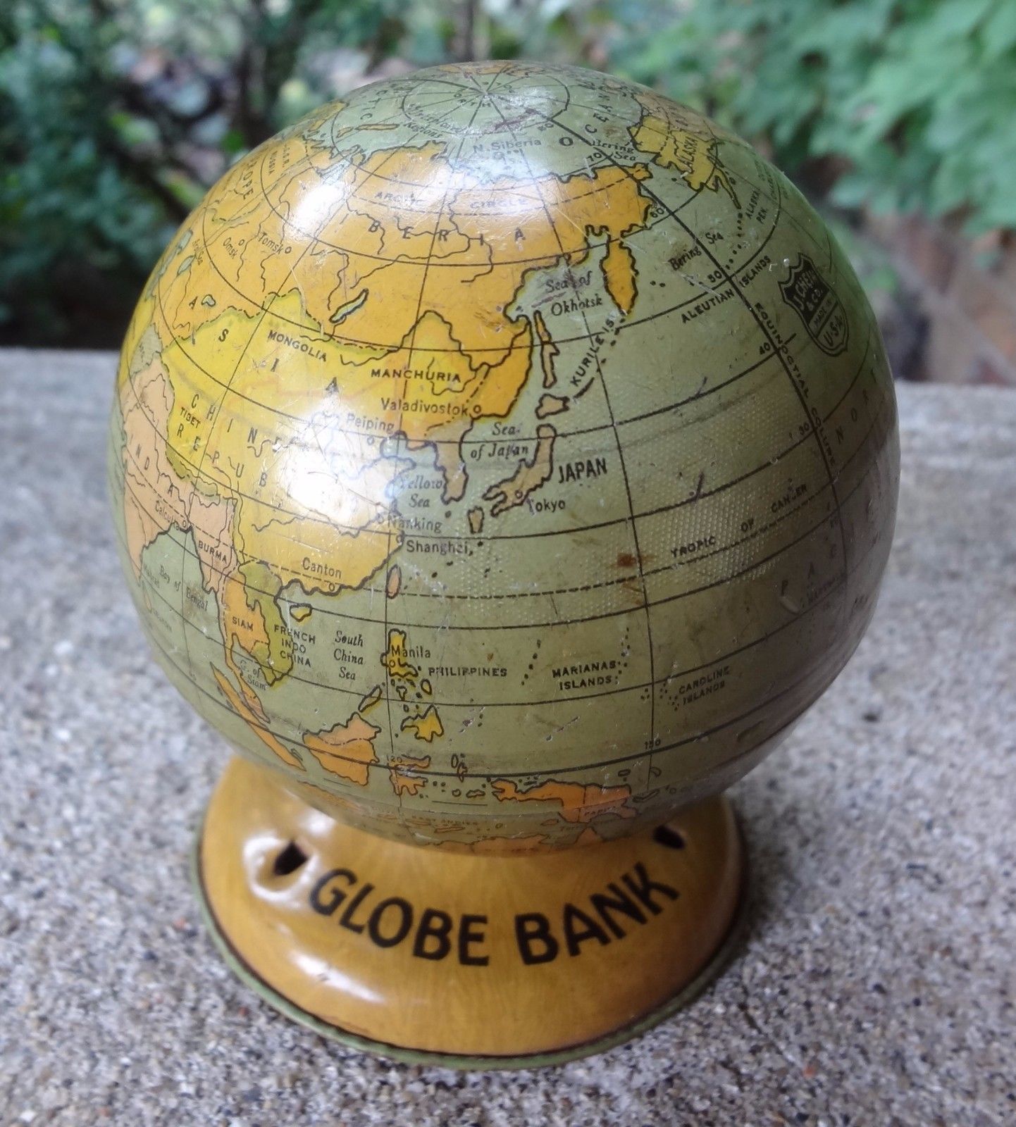 Title (ebay affiliate link): Globe Coin Bank Litho Tin J. CHEIN & CO Made USA VTG Earth toy Persia Siam