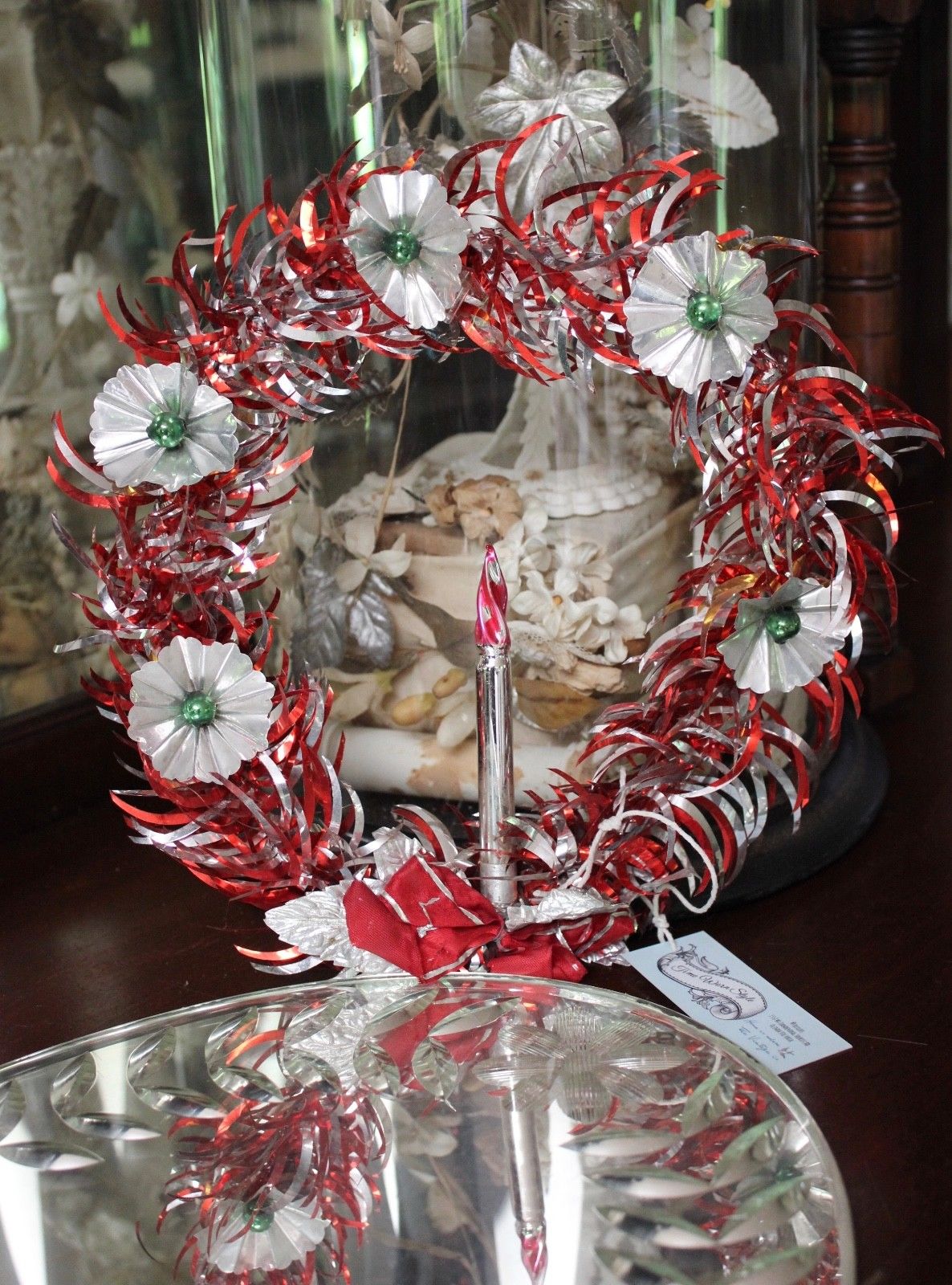 Title (ebay affiliate link): CHRISTMAS Vintage Tinsel WREATH ornament Mercury Glass CANDLE