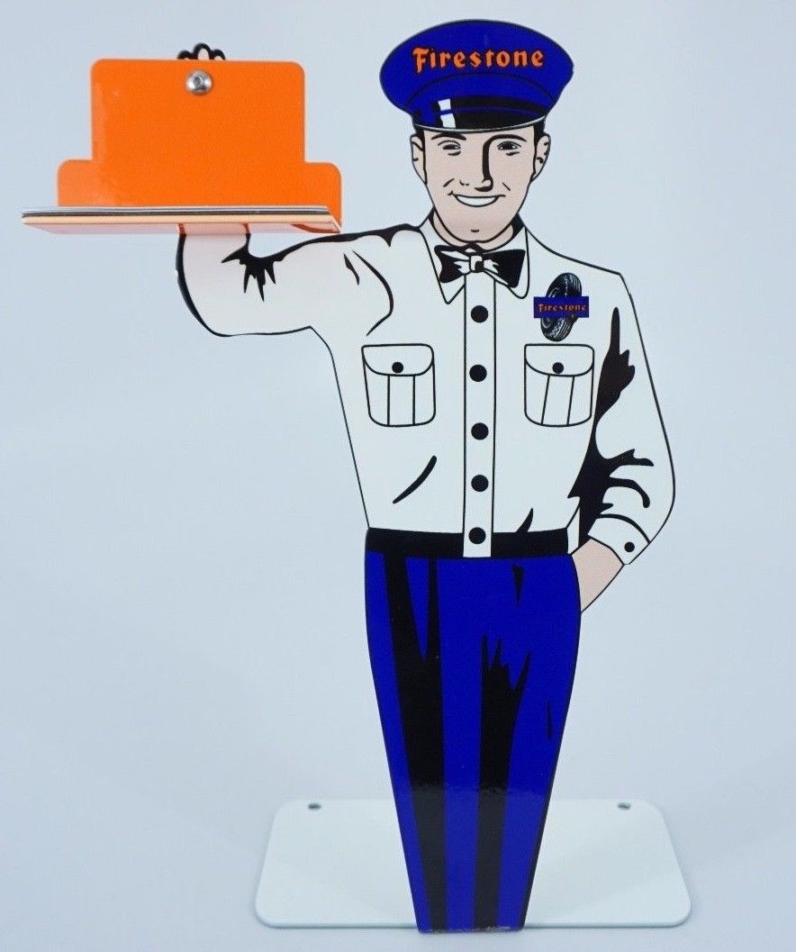 VINTAGE FIRESTONE TIRES STAND-UP ATTENDANT MAN 12" METAL TIRE, GASOLINE OIL SIGN