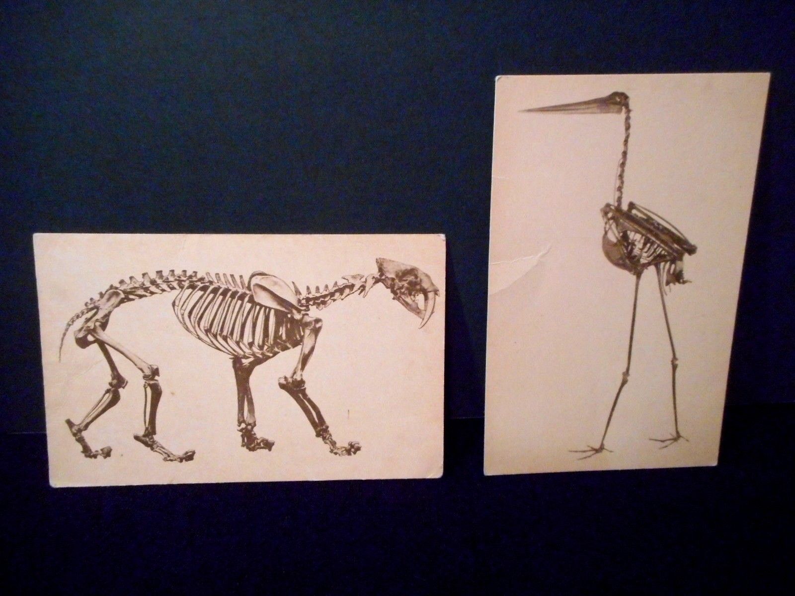 2 VTG ARTVUE Postcards La Brea Tar Pits Museum Stork & Saber-toot Tiger skeleton