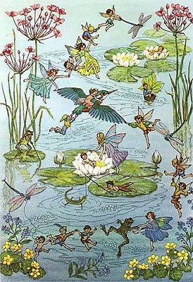 Title (ebay affiliate link): Molly Brett Postcard Water Fairies Medici Fairy Hummingbird Frog Dragonfly Lily
