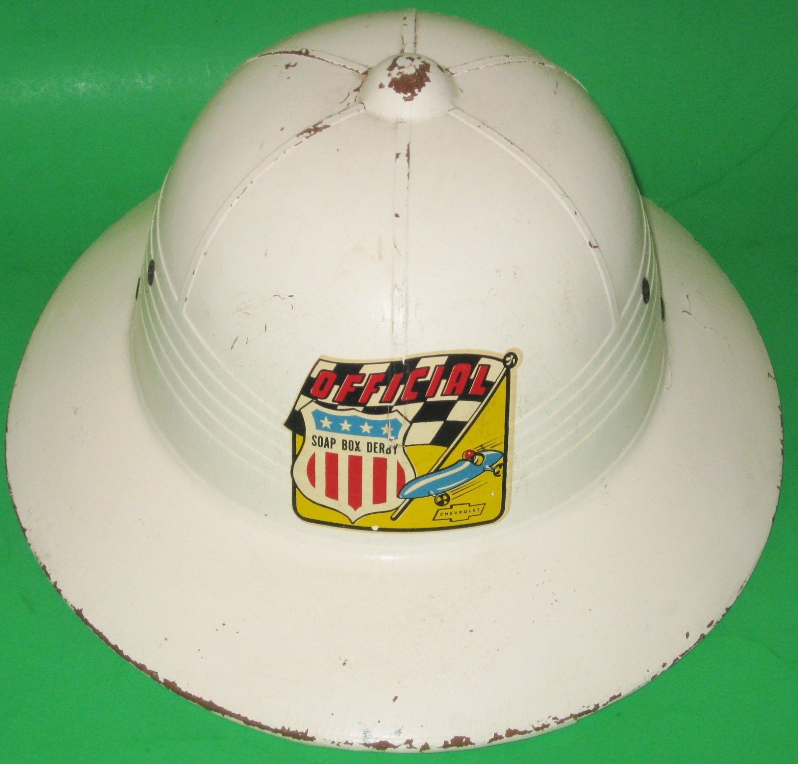 Title (ebay affiliate link): RARE Antique Vintage WHITE Chevrolet Soapbox Derby Pith Helmet FIBER WATER TRANS