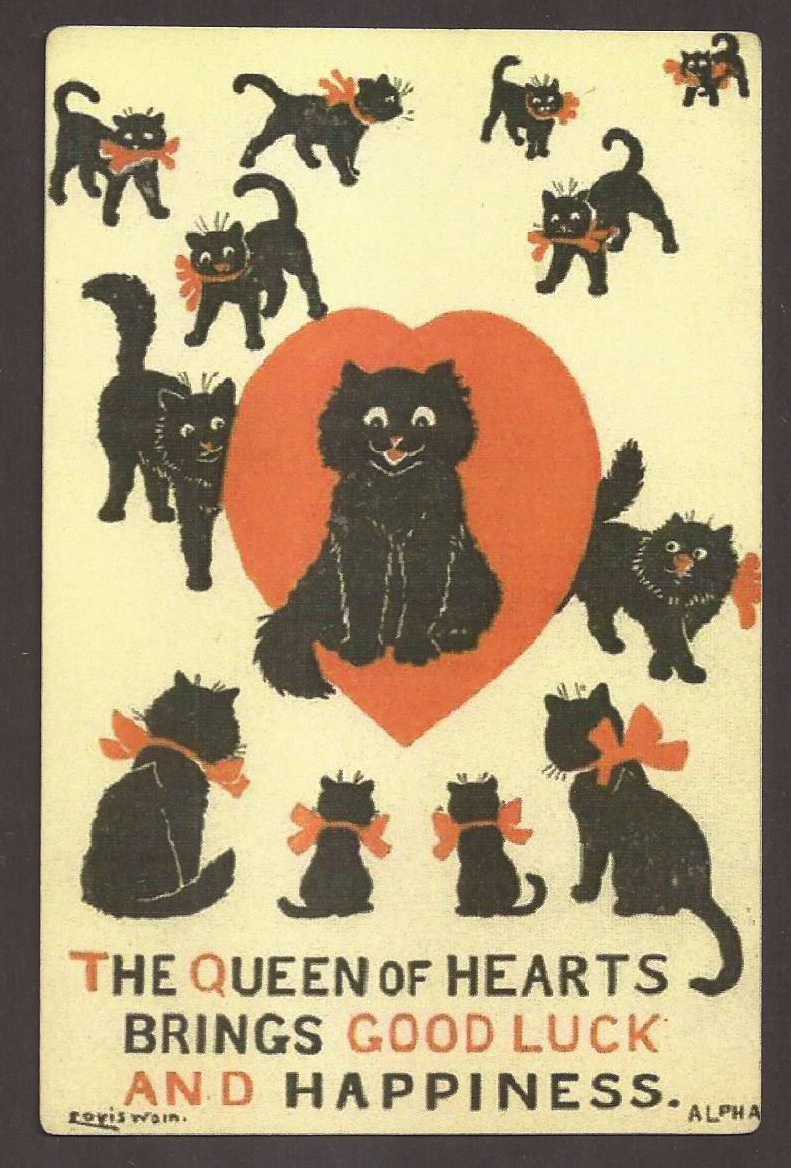 Title (ebay affiliate link): The Queen of Hearts Brings Good Luck and Happines, Black Cats, Postcard