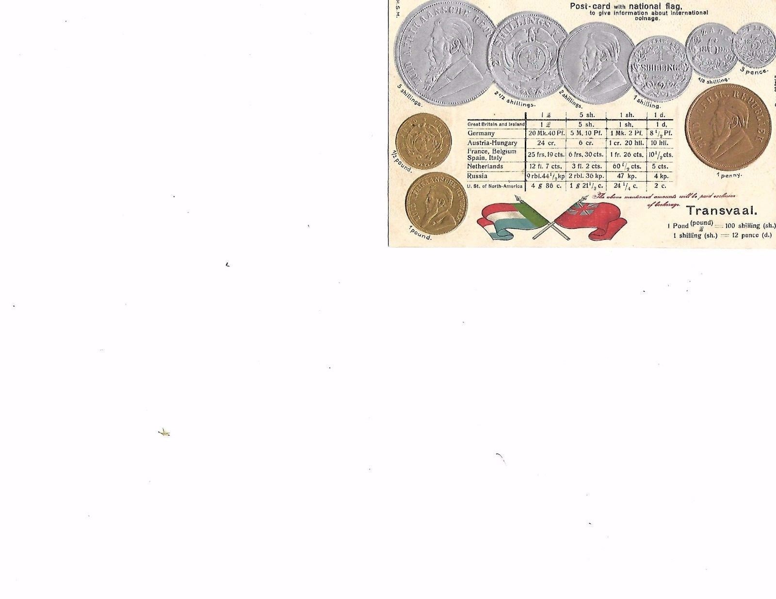 Title (ebay affiliate link): Postcard "TRANSVAAL" -Coins Motif & Flag-Facsimiles-Embossed-