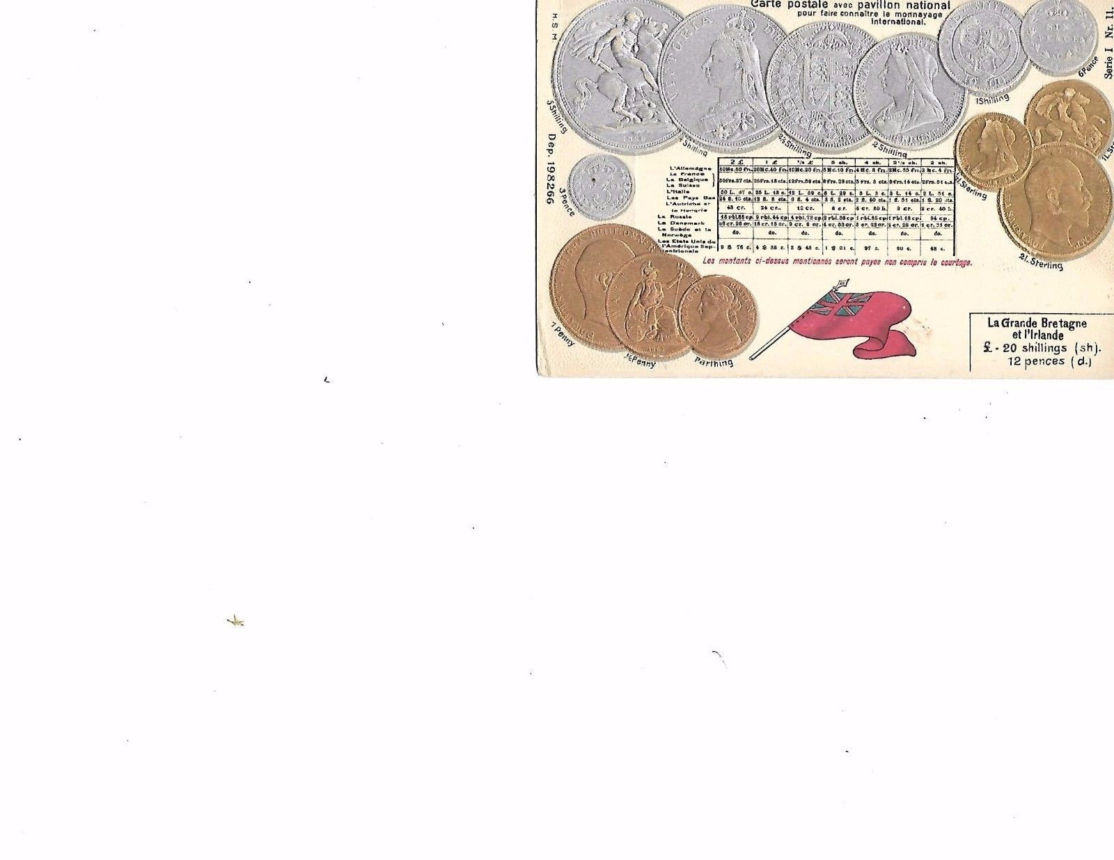 Title (ebay affiliate link): PC "La Grande Bretagne et I''Ireland" -Coins Motif & Flag-Facsimiles-Embossed-