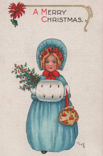 Title (ebay affiliate link): A/S MARY LaFETRA RUSSELL ~ PRETTY GIRL IN BLUE W/ CHRISTMAS HOLLY Ermine Muff PC
