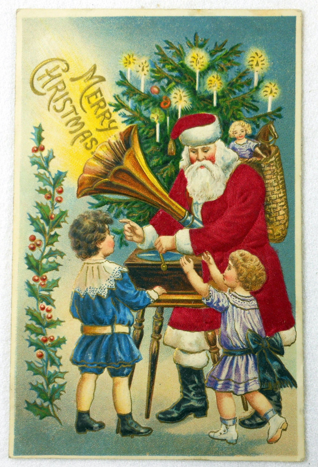 c1910 Santa Red Flocked Velvet Robe & Gramophone Record Player Postcard