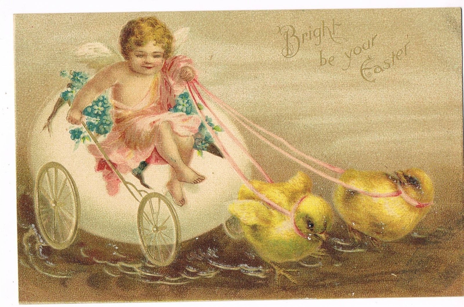 ANTIQUE EASTER Postcard CHERUB BEING PULLED IN EASTER EGG BY EASTER CHICKS