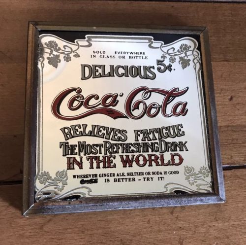 Title (ebay affiliate link): Vintage Coca Cola Mirror Sign 5 Cent Square Antique Frame Coaster Coke Delicious
