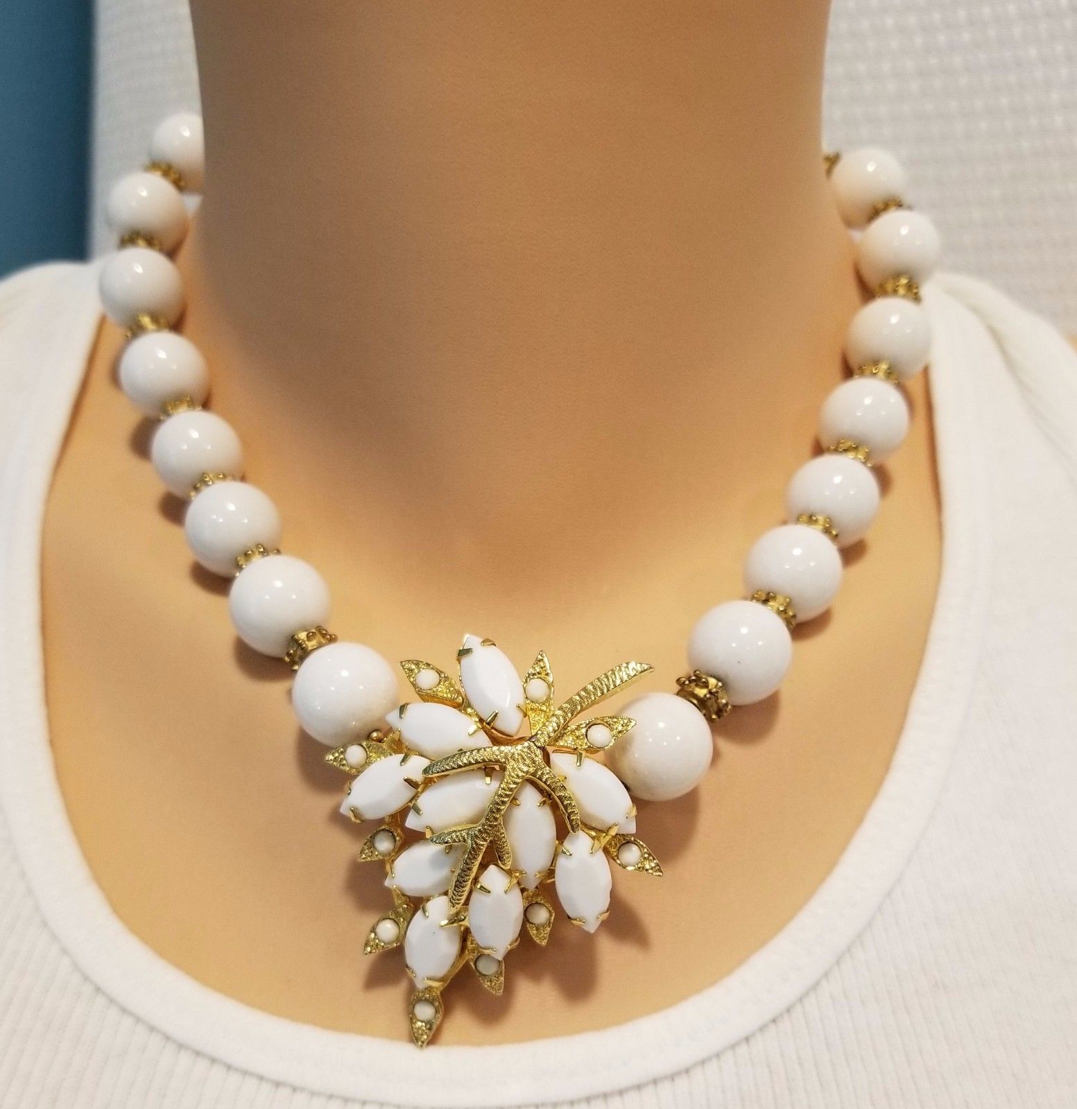 Vintage white milk glass brooch necklace white glass beads gold tone spacers