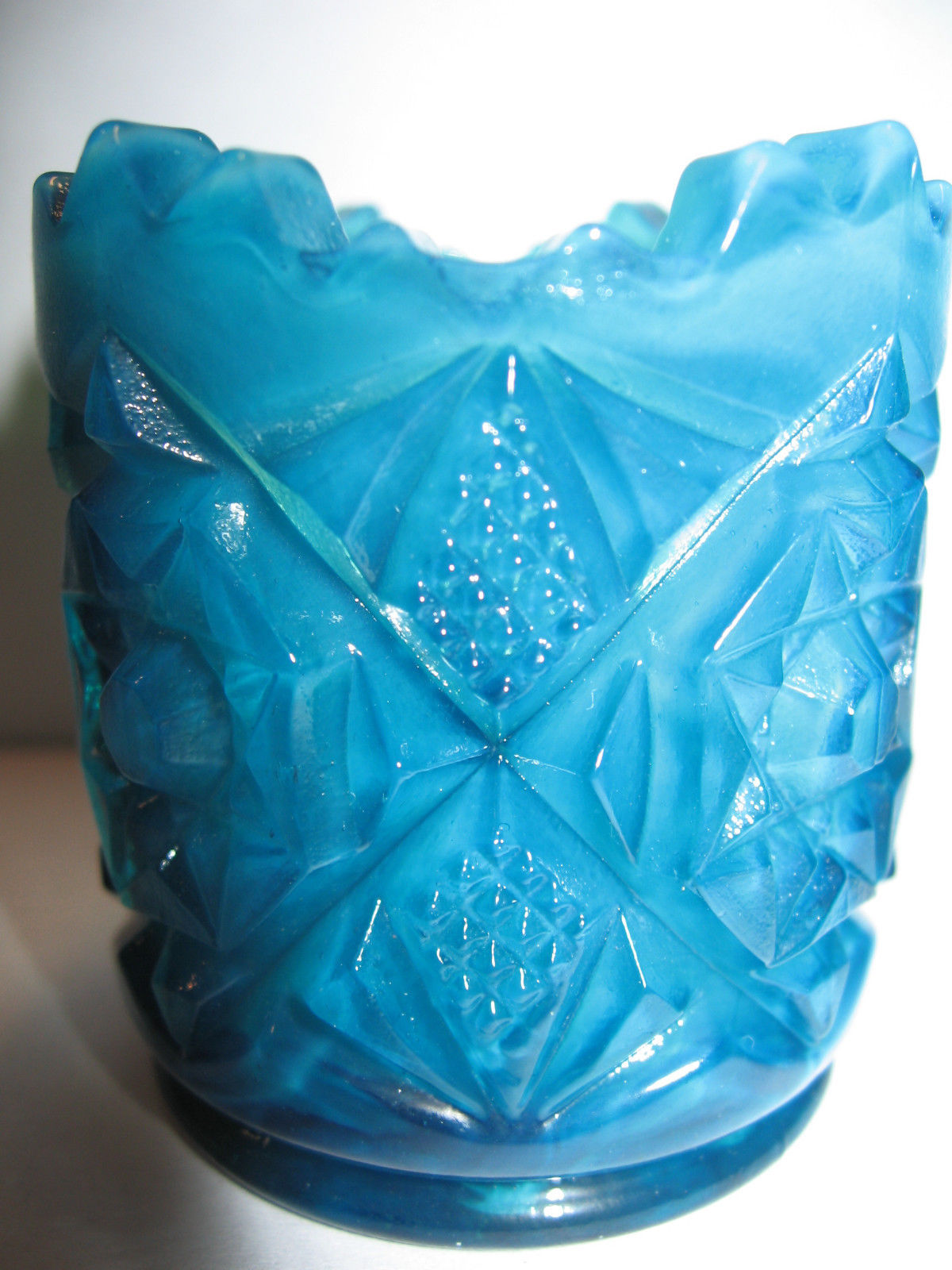 Blue milk glass toothpick holder star diamond pattern match slag opaque shot art