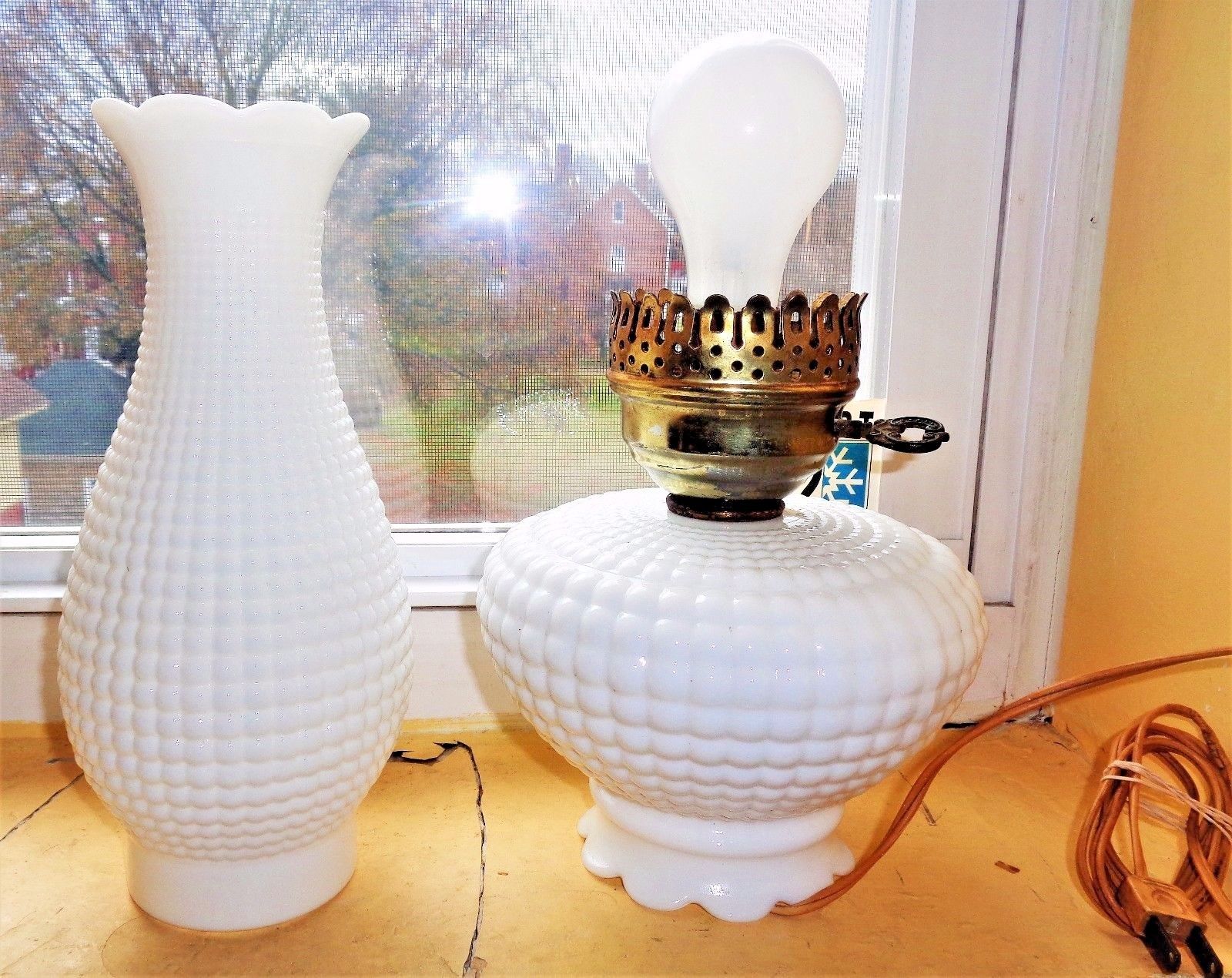Title (ebay affiliate link): Vintage White Hobnail Milk Glass Hurricane Electric Table Lamp w/ Chimney 16"