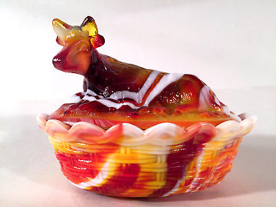 Title (ebay affiliate link): LG Wright Red Orange Yellow Milk Glass Slag Cow Covered Dish