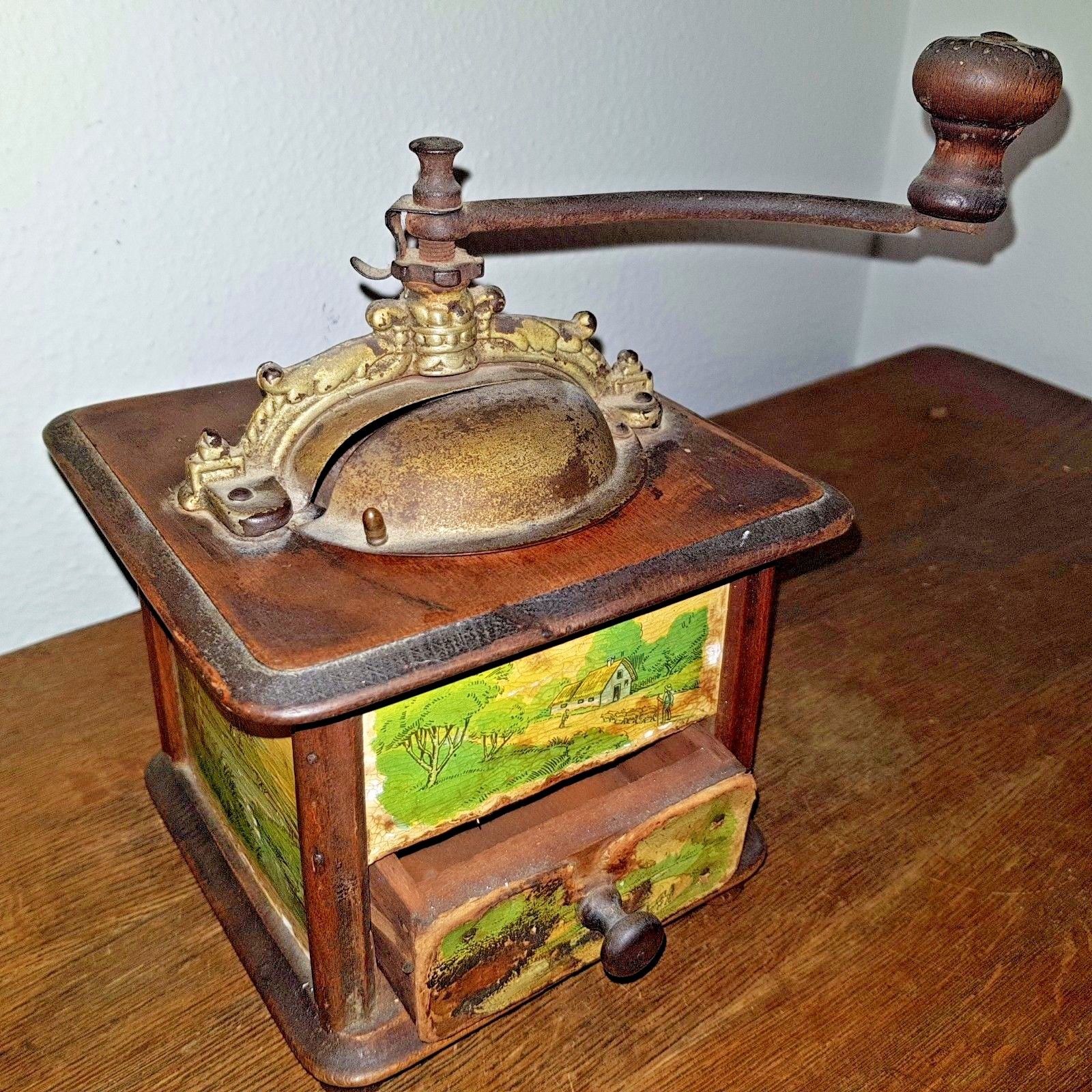 Title (ebay affiliate link): Antique JAPY FRERES Coffee Grinder Wooden Medieval Peasant Scene Painted Paper