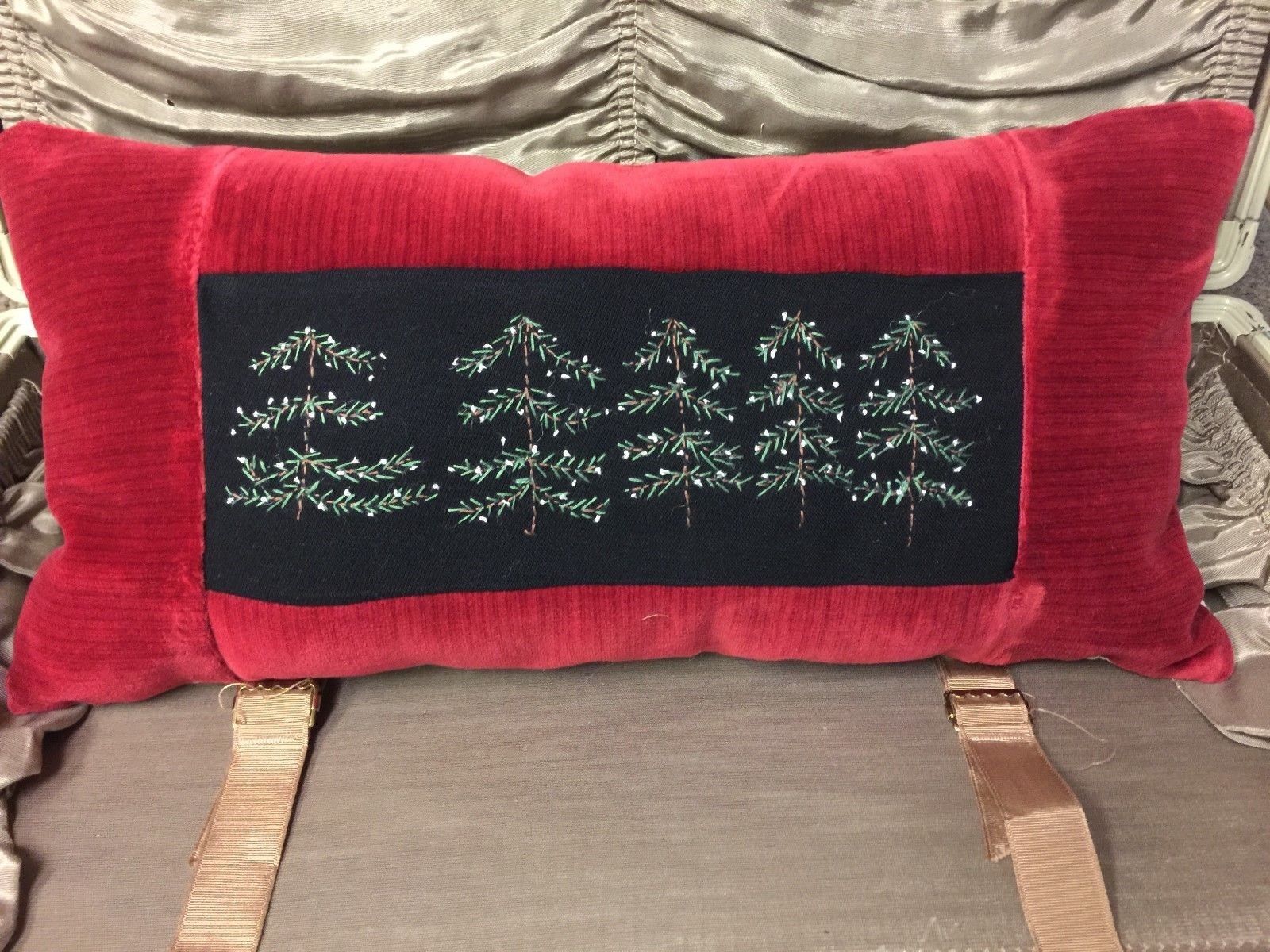 Title (ebay affiliate link): Primitive Stitchery Lg Pillow Christmas 5 Evergreen Trees Red Border
