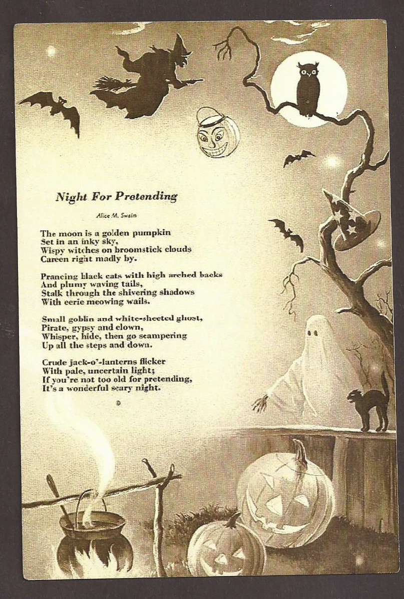 Halloween Poem, Night For Pretending, Witch, Ghost Cat Pumpkin Owl, Postcard CP,