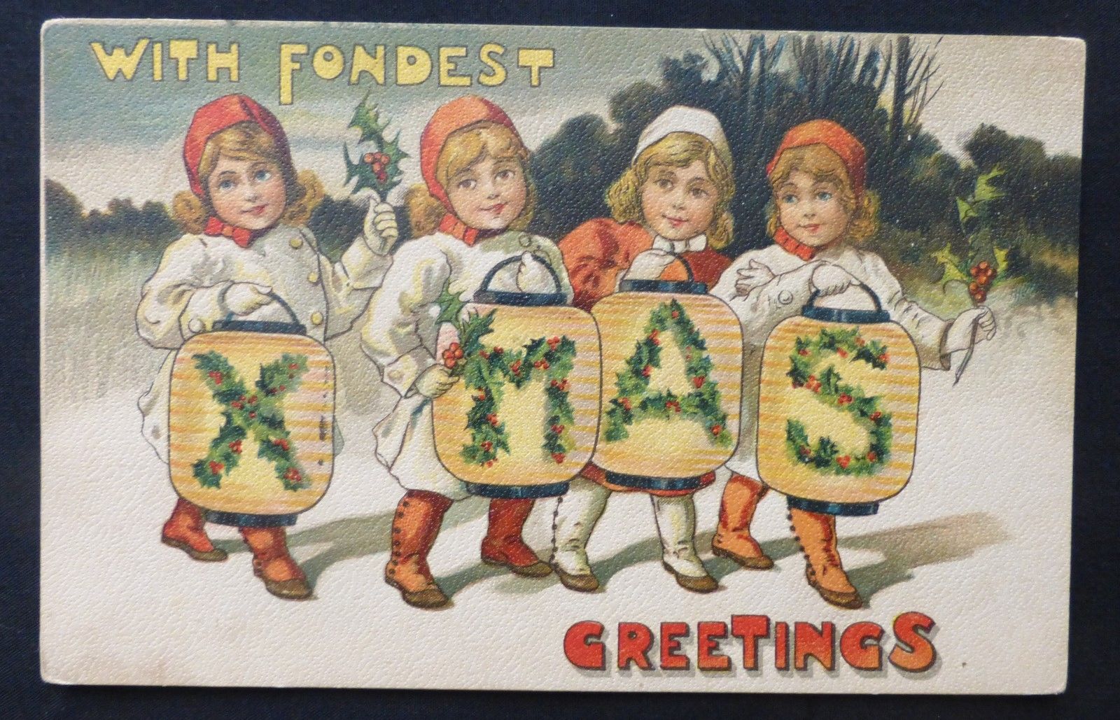 Title (ebay affiliate link): PC CUTE GIRLS HOLDING LARGE LETTER XMAS by BB London & N.Y. Series #6689