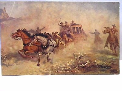 1910 POSTCARD " HOLDUP ON AN OVERLAND COACH " ROBBERS ON HORSEBACK , GUNS UNUSED