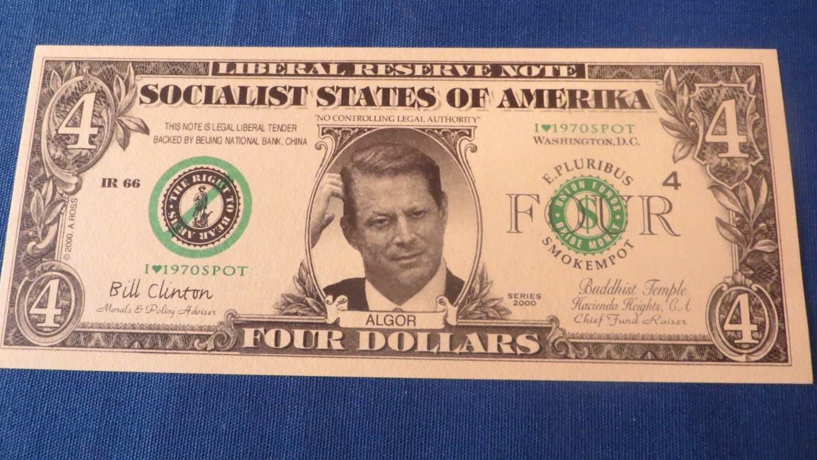 Title (ebay affiliate link): Vice President Gore $4 Novelty Note Series 2000 Crisp Uncirculated