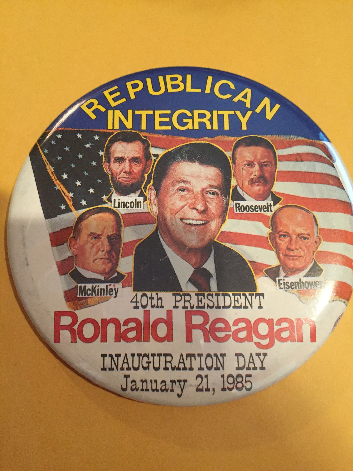 Title (ebay affiliate link): Ronald Reagan 1985 "Republican Integrity" w/ Lincoln, Eisenhower, button pinback