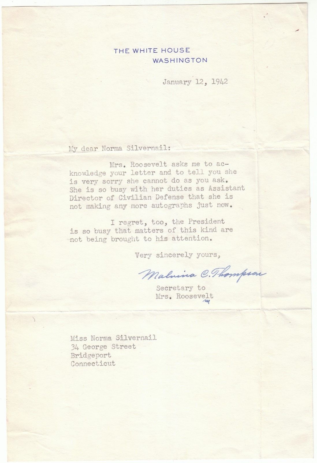 1942 WHITE HOUSE LETTER FROM MALVINA THOMPSON - SECRETARY TO ELEANOR ROOSEVELT