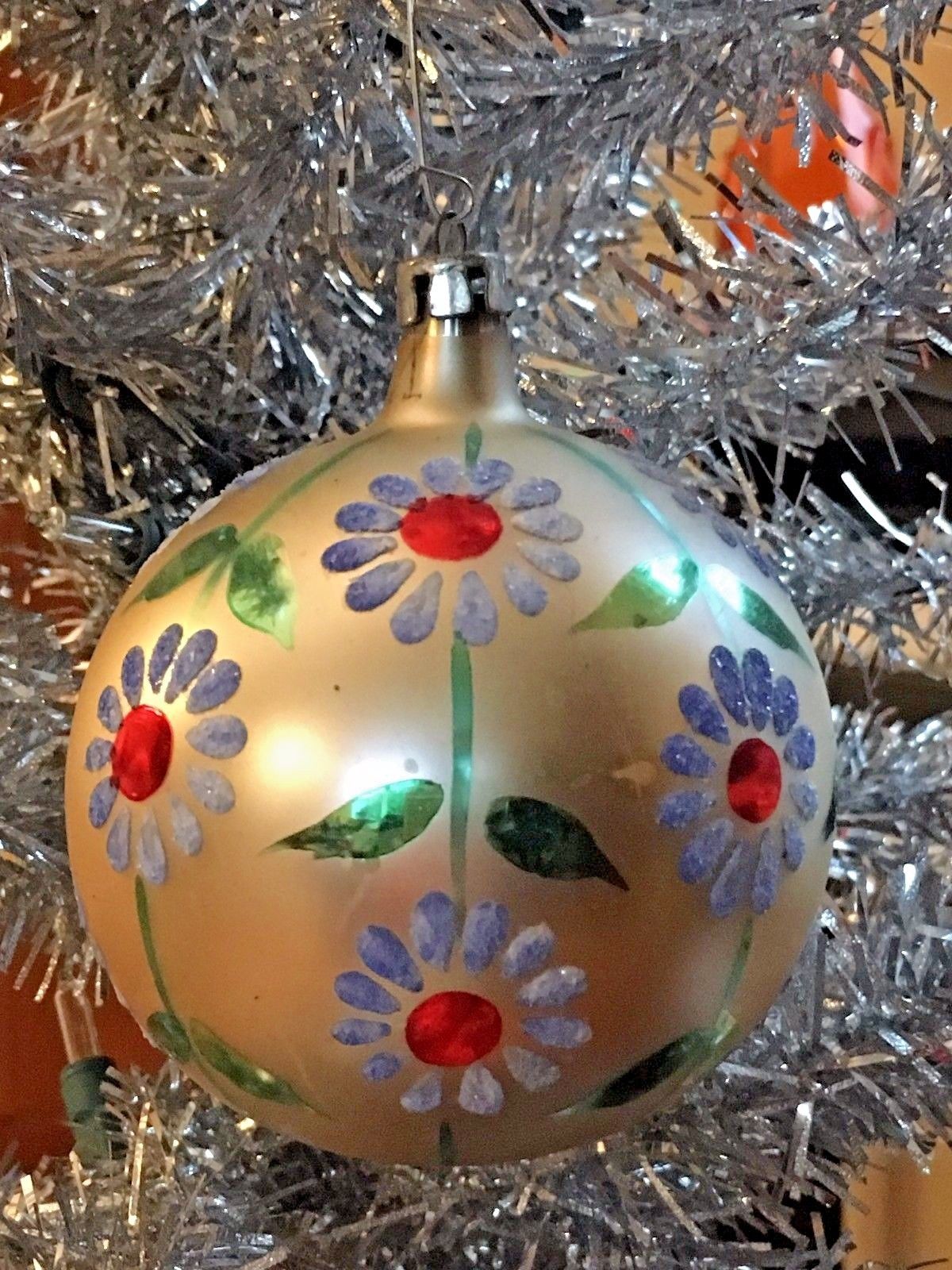 Title (ebay affiliate link): VTG JUMBO POLAND MERCURY GLASS CHRISTMAS ORNAMENT BLUE MICA DAISY HAND PAINTED