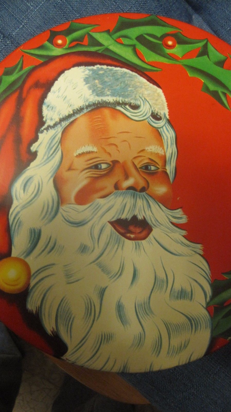 Title (ebay affiliate link): VINTAGE SANTA CLAUS CANDY TIN OLD HOLLY LEAF & BERRY COOKIE TIN METAL TREAT CAN