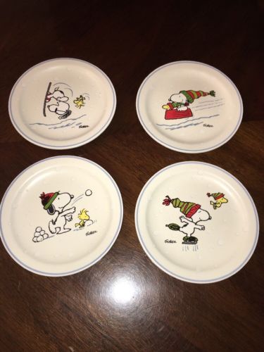Title (ebay affiliate link): Peanuts Snoopy & Woodstock Christmas winter fun ceramic dessert plates hallmark