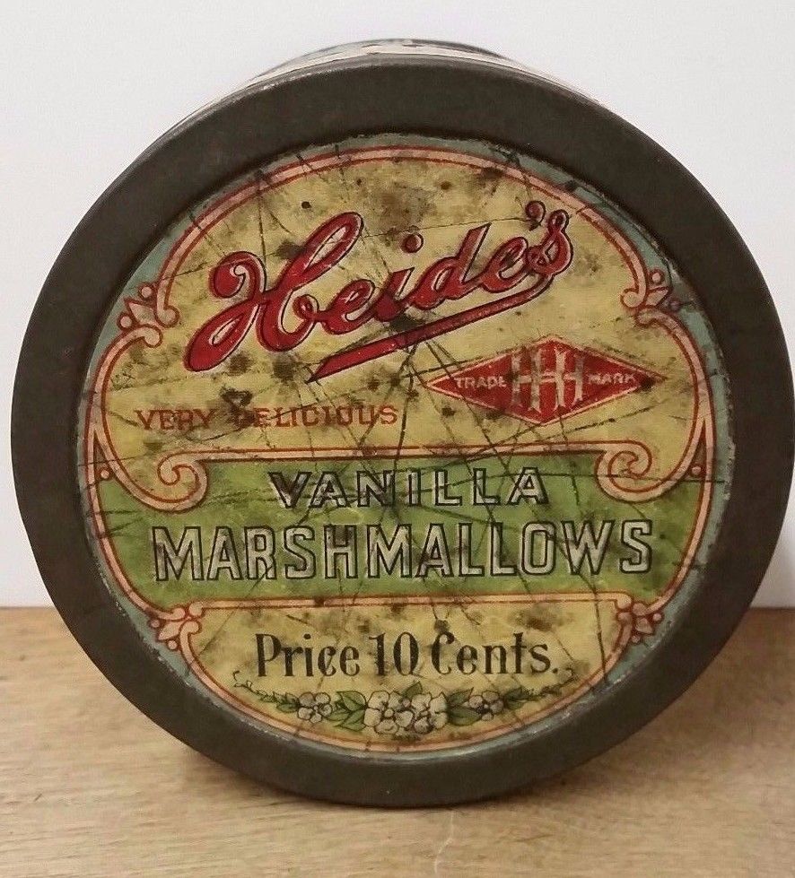 Title (ebay affiliate link): Original Heide''s Vanilla Marshmallows Advertising Tin Henry Heide Sample Size NR